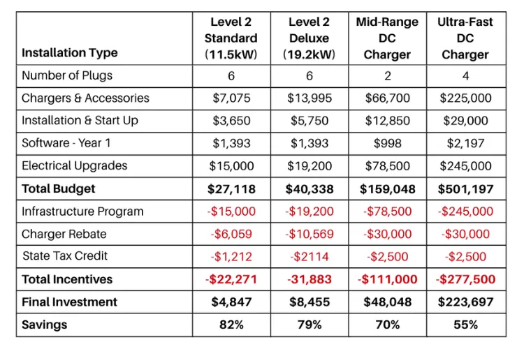 Collect cash rebates of $250/kW on Level 2 charging and $150/kW on DC charging up to 50% of the cost.